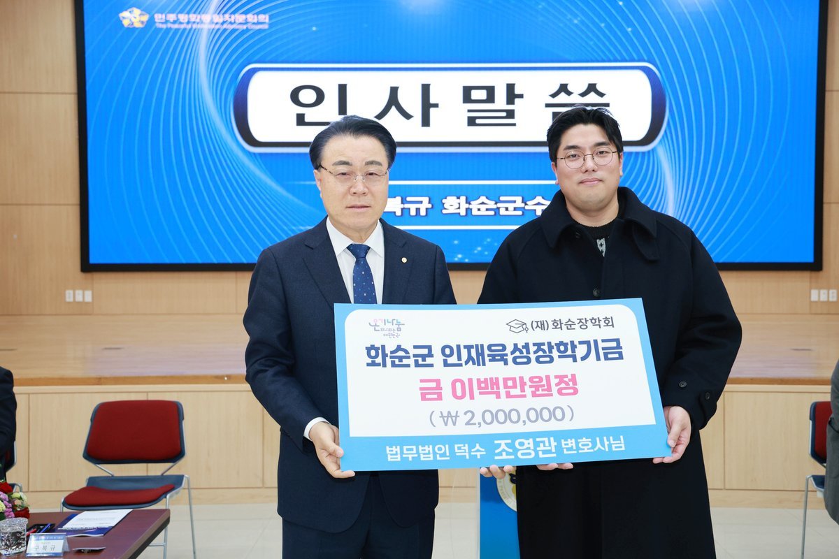 [한국Q뉴스] 화순장학회는 지난 3일 법무법인 덕수 조영관 변호사가 고향 인재 양성을 위해 장학금 200만 원을 기부했다고 밝혔다.