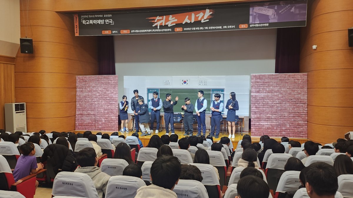 [한국Q뉴스] 상주시청소년상담복지센터는 12월 9일 초·중학생 340여 명을 대상으로 청소년 폭력 예방 연극 ‘쉬는시간’을 상주시청소년수련관 세미나실에서 진행했다.