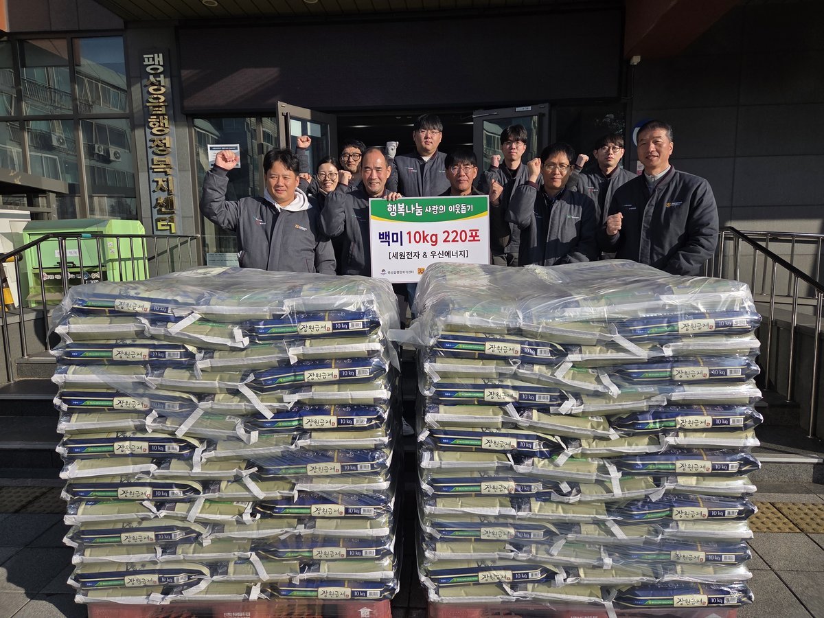이에 이근영 팽성읍장은 “해마다 지속적인 기부와 따뜻한 사회공헌활동을 이어오고 있는 ㈜세원전자와 우신에너지㈜에 깊은 감사의 마음을 전한다”라며 “기부하신 백미는 도움이 필요한 가정에 소중히 전달해 지역 주민들이 따뜻한 겨울을 보낼 수 있도록 하겠다”라고 전했다.