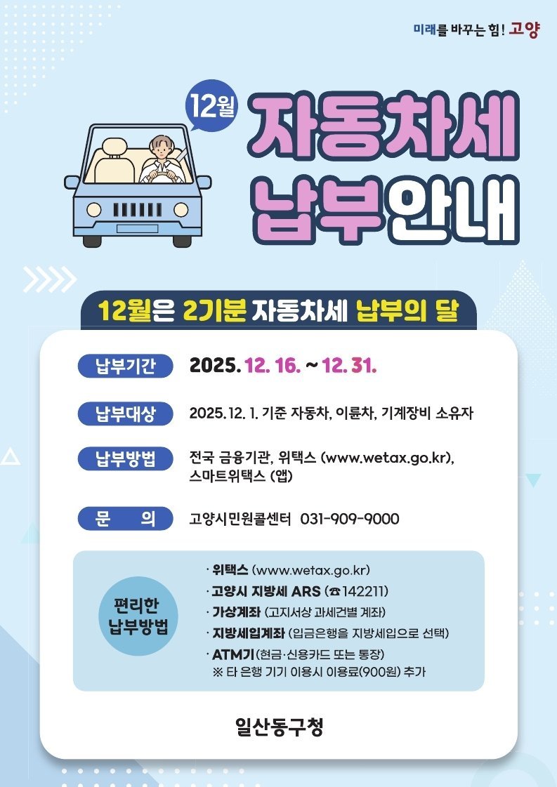 [한국Q뉴스] 고양특례시 일산동구는 2025년 제2기분 자동차세 총 6만9572건, 약 115억 원을 부과하고, 지난 12일 고지서를 발송했다고 밝혔다.