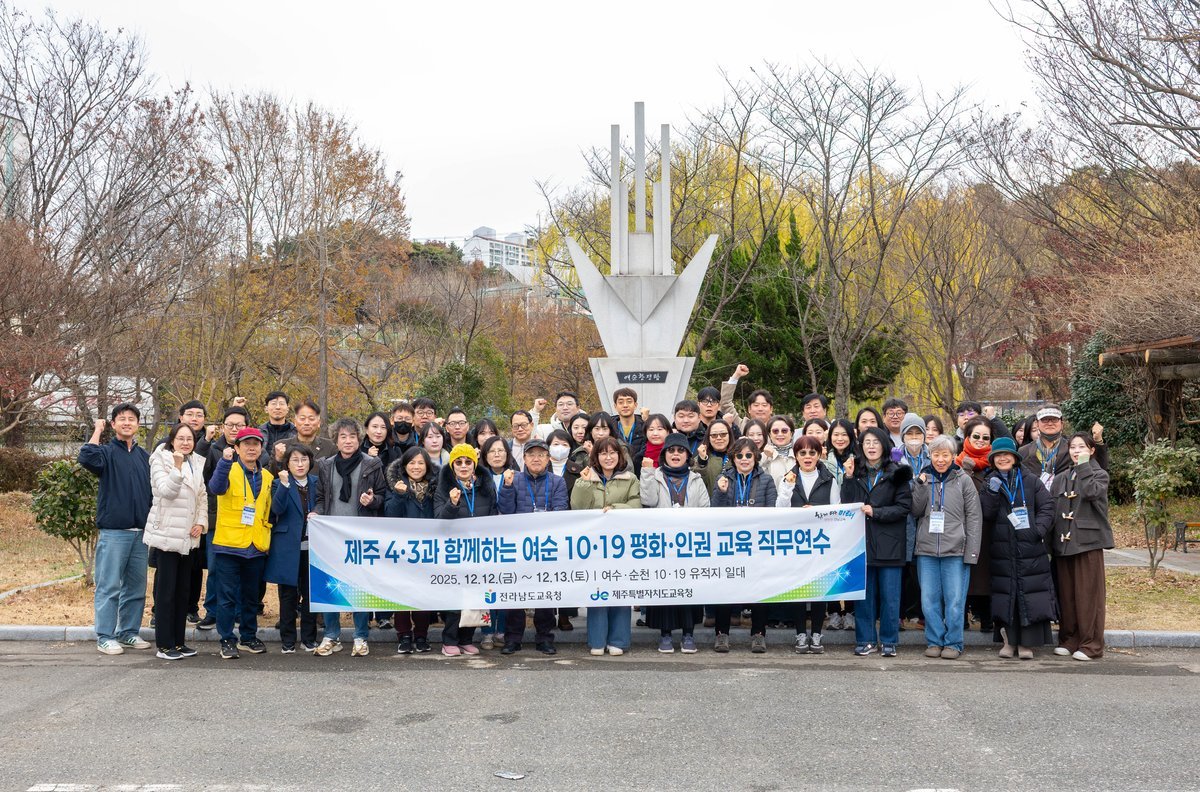 [한국Q뉴스] 전라남도교육청과 제주특별자치도교육청은 12~13일 여수 순천 10·19 유적지에서 전남·제주 교원들이 함께하는 직무연수를 운영하며, 우리 현대사의 아픔을 성찰하는 평화·인권 교육을 학교 현장에 뿌리내리는 데 힘을 모으고 있다.