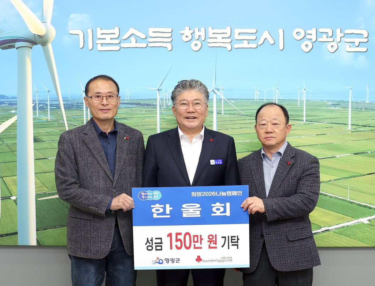 [한국Q뉴스] 영광군은 12월 12일 지역발전을 위해 활발히 활동하고 있는 1965년생 또래모임인 한울회에서 희망2026나눔캠페인 성금 150만 원을 기탁했다고 밝혔다.