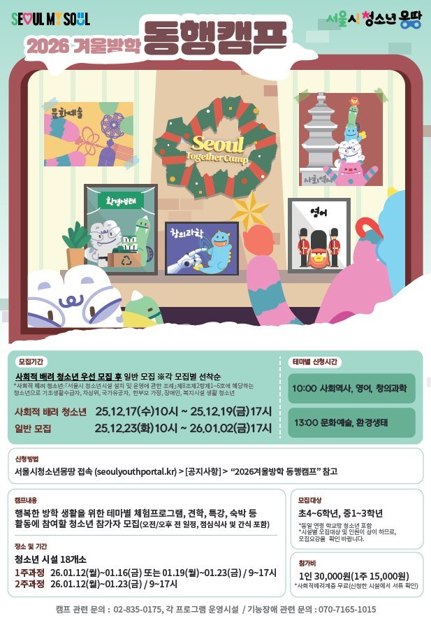 [한국Q뉴스] 서울시가 다가오는 겨울방학을 맞아 청소년들의 돌봄 공백을 해소하고 진로 탐색의 기회를 제공하는 ‘서울시 청소년 동행캠프’를 추진한다고 밝혔다. 이번 캠프는 2026년 1월 12일부터 23일까지 2주간 서울시립청소년시설 24개소에서 진행된다.
