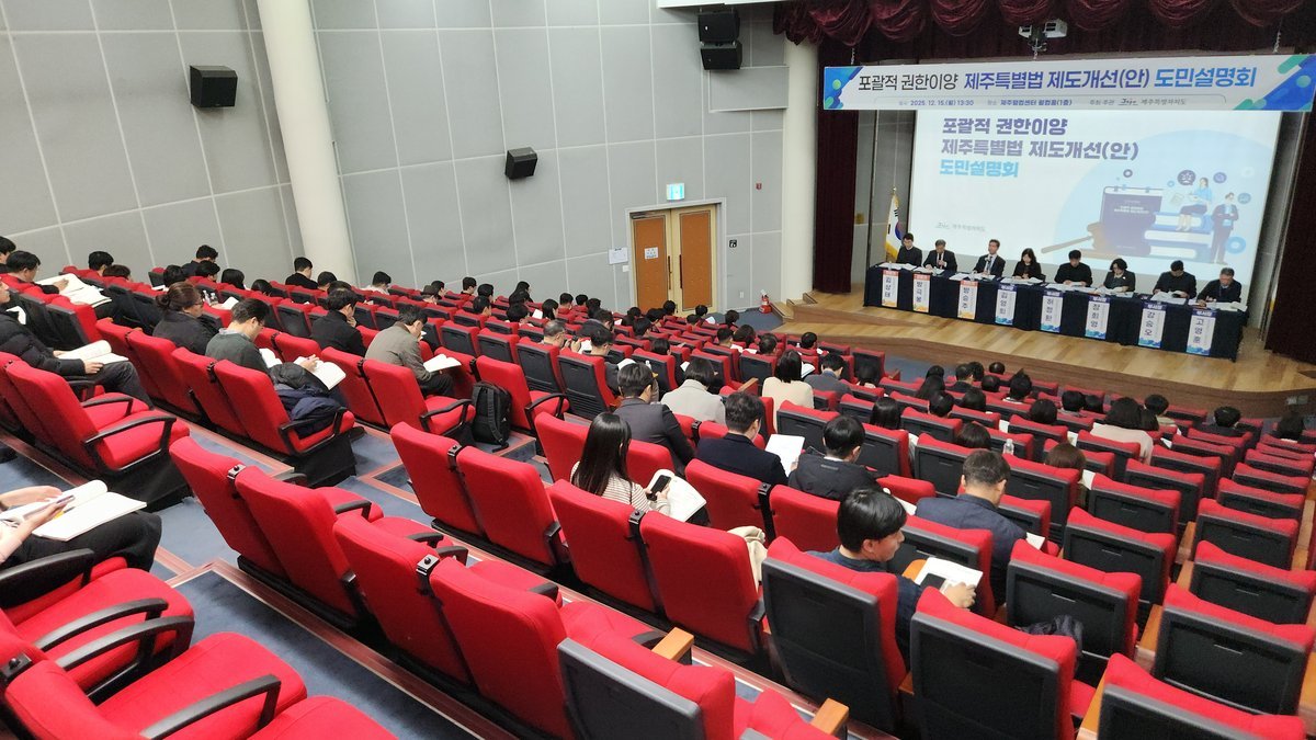 [한국Q뉴스] 제주특별자치도는 15일 오후 1시 30분부터 제주웰컴센터 웰컴홀에서 공무원과 도민 등 200여명이 참여한 가운데 포괄적 권한이양 제주특별법 제도개선안에 대하여 도민 이해도를 높이고, 다양한 의견 수렴을 위해 도민설명회를 개최했다.
