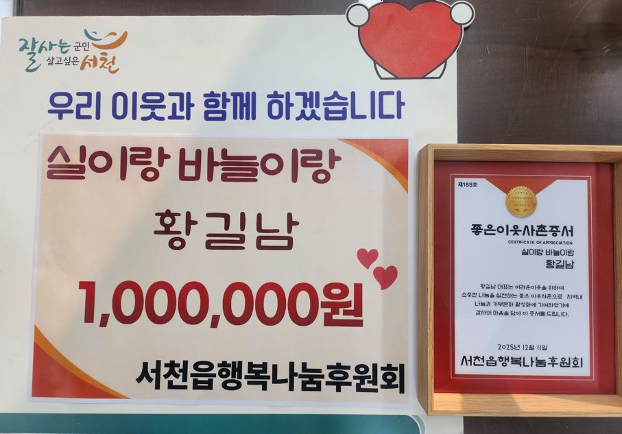 [한국Q뉴스] ‘실이랑 바늘이랑’의 황길남 대표는 지난 16일 서천읍행복나눔후원회에 후원금 100만원을 기탁하며 연말 이웃사랑을 실천했다.