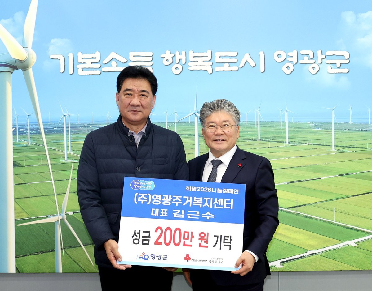 [한국Q뉴스] 영광군은 지난 12일 영광주거복지센터에서 이웃돕기 성금 200만 원을 기탁하여 희망2026나눔캠페인에 참여했다고 밝혔다.
