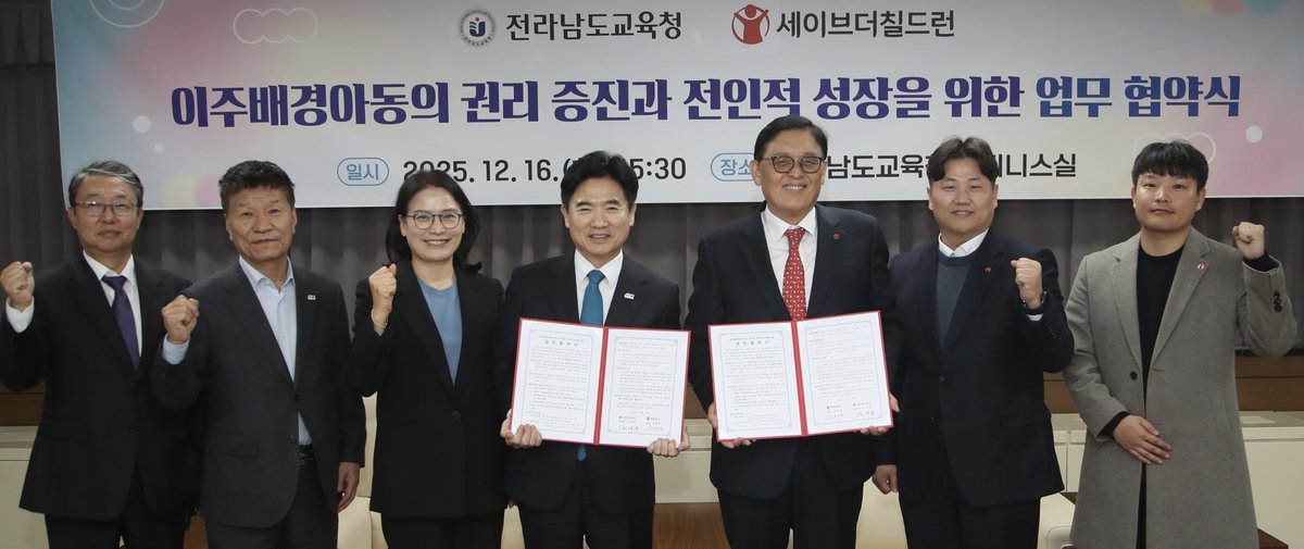[한국Q뉴스] 전라남도교육청은 16일 청사 비즈니스실에서 세이브더칠드런과 ‘이주배경아동의 권리 보장과 전인적 성장을 위한 업무협약’을 체결했다.
