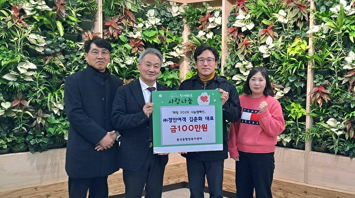 [한국Q뉴스] 안동시 ㈜경안여객은 12월 16일 용상동행정복지센터를 방문해 소외된 이웃들에게 사랑과 희망을 전달하고자 ‘희망 2026 나눔캠페인’릴레이에 동참하며 100만 원을 기탁했다.