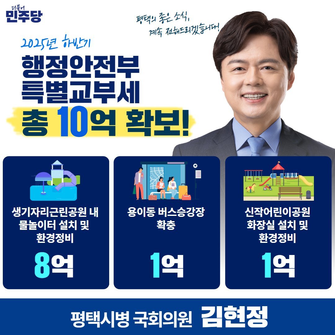 이번에 확보한 특별교부세는 △생기자리 근린공원 내 물놀이시설 설치 및 환경정비 사업 8억 원, △용이동 버스승강장 확충 사업 1억 원, △신작어린이공원 화장실 설치 및 환경정비 사업 1억 원 등으로, 주민들이 일상에서 직접 체감할 수 있는 생활밀착형 사업에 집중 투입될 예정이다.
