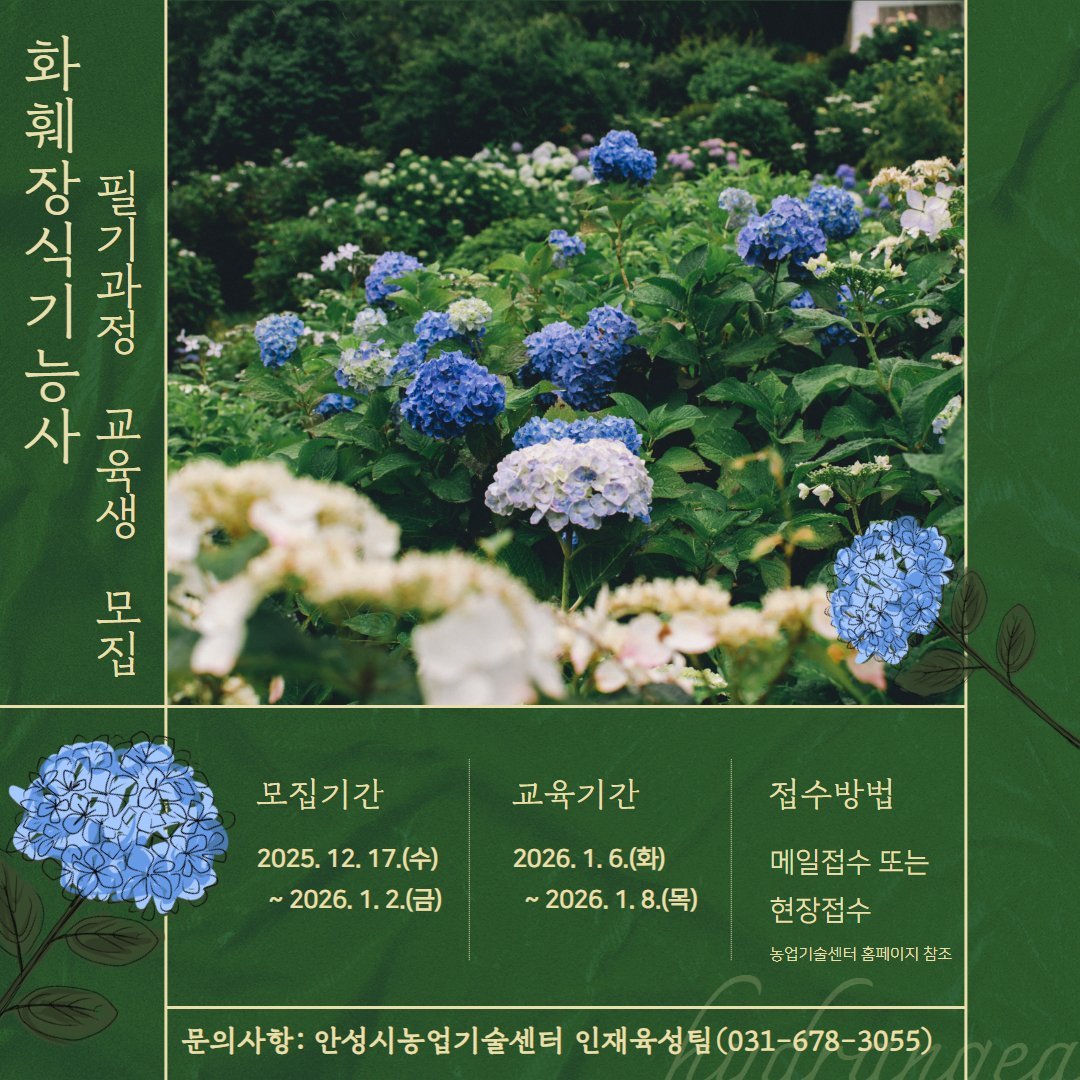 [한국Q뉴스] 수료자 대상 2월 중 실기 과정 운영 예정 안성시농업기술센터는 오는 26년 1월 2일까지 화훼장식기능사 필기과정 교육생을 모집한다고 밝혔다.
