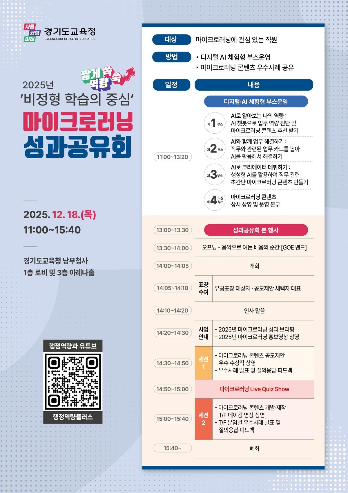 [한국Q뉴스] 경기도교육청은 18일 남부청사에서 ‘마이크로러닝’ 사업 성과 공유와 개선 방안 마련을 위한 ‘2025년 비정형 학습의 중심, 마이크로러닝 성과공유회’를 개최했다.