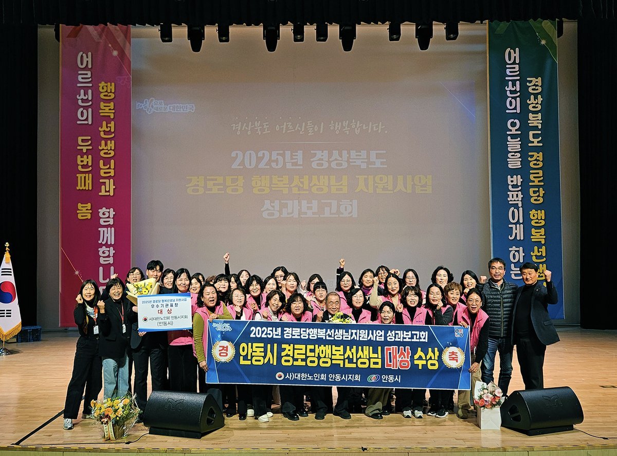 [한국Q뉴스] 안동시와 대한노인회 안동시지회는 12월 18일, 경상북도가 경북도청 동락관에서 개최한 ‘경로당 행복선생님 지원사업 2025년도 성과보고회’에서, 도내 22개 수행기관을 대상으로 한 사업평가 결과 ‘대상’을 수상하는 영예를 안았다.
