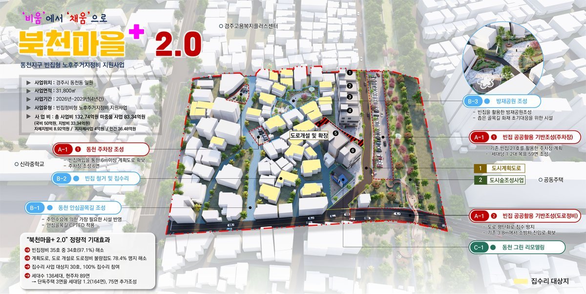 경주시는 빈집이 밀집된 북천마을을 중심으로 주거환경 개선과 생활 인프라 확충, 공동체 회복을 목표로 ‘북천마을 플러스 2.0 - 비움에서 채움으로’라는 비전 아래 공모에 참여해 최종 선정됐다.