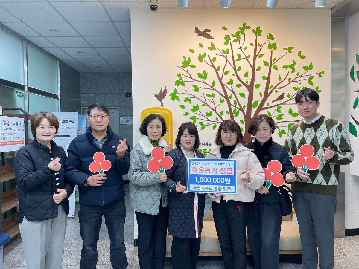 [한국Q뉴스] 영주시 가흥1동 영주가흥사랑으로부영아파트 통장 일동은 지난 19일, 가흥1동행정복지센터에 방문해 이웃돕기 성금 100만원을 기탁하며 ‘희망2026 나눔캠페인’에 동참했다.
