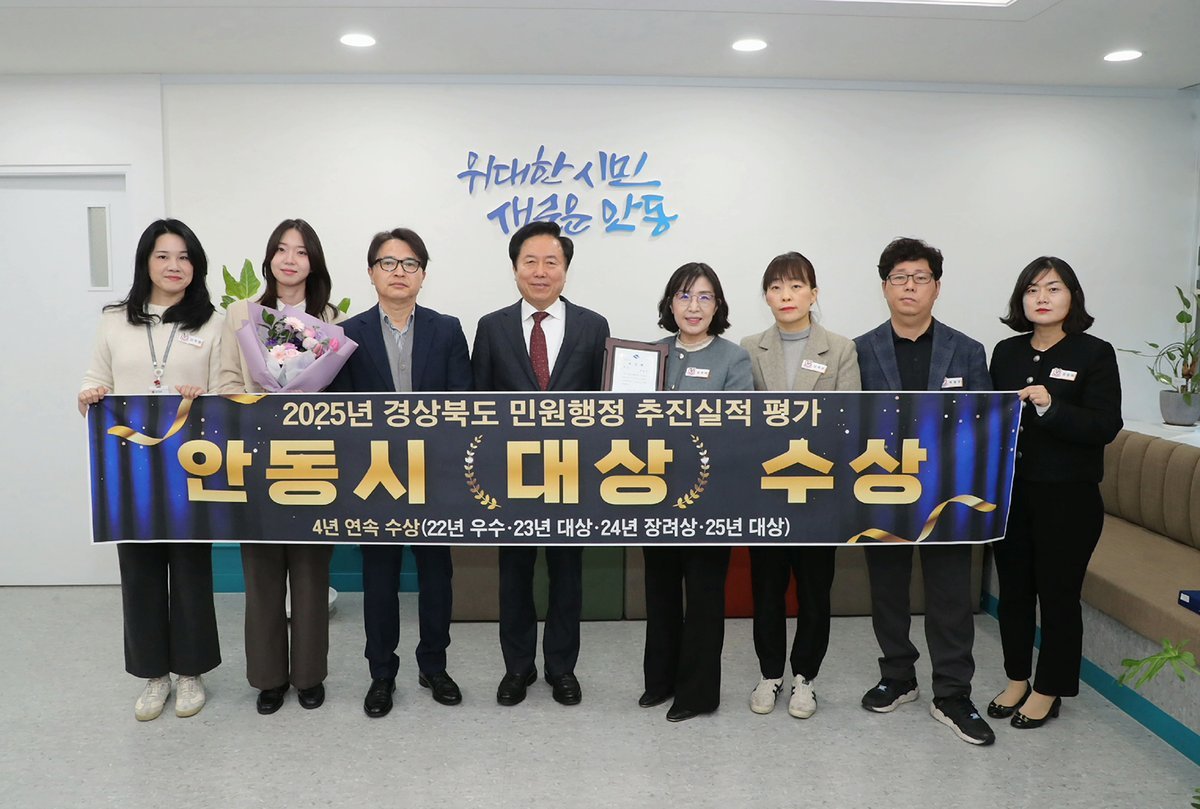 이러한 노력의 결과 안동시는 ‘2025년 경상북도 민원행정 추진실적 평가’에서 대상을 받아 2022년부터 4년 연속 수상이라는 성과를 거뒀으며, 2025년 정부혁신 우수부서 “장려상”도 수상했다.