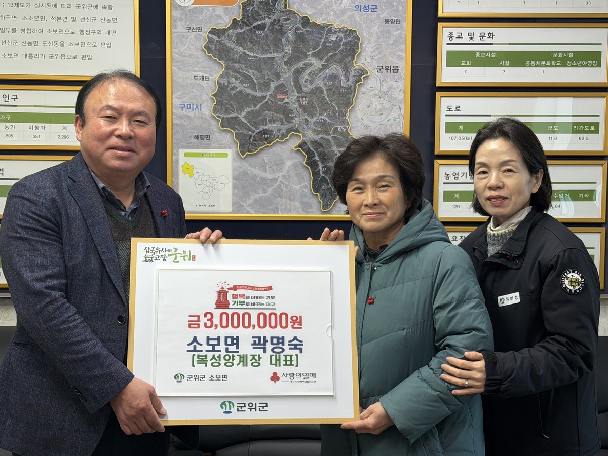 [한국Q뉴스] 소보면은 지난 26일, 복성양계장 곽명숙 대표가 ‘희망2026나눔캠페인’에 성금 300만원을 기탁했다고 밝혔다.