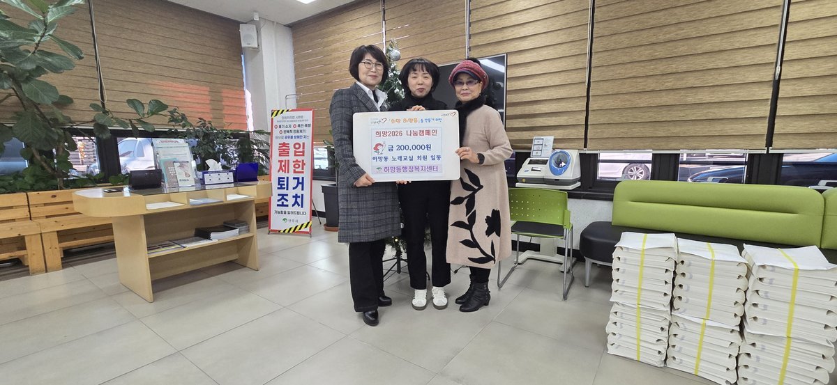 [한국Q뉴스] 영주시 하망동은 지난 26일 하망동 주민자치프로그램 노래교실이 ‘희망2026 나눔캠페인’에 성금 20만 원을 기탁했다고 밝혔다.