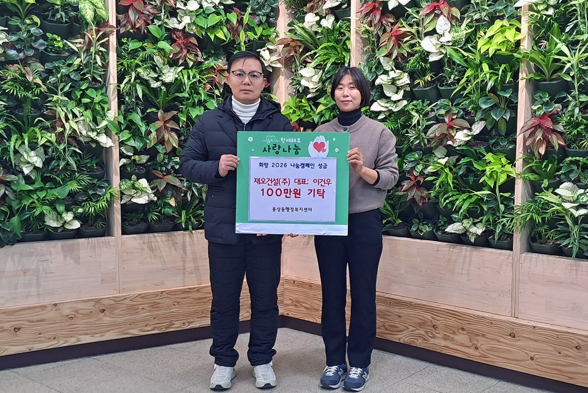 [한국Q뉴스] 재오건설 는 12월 26일 용상동행정복지센터를 방문해, 희망2026 나눔캠페인에 동참하며 성금 100만 원을 기탁했다.