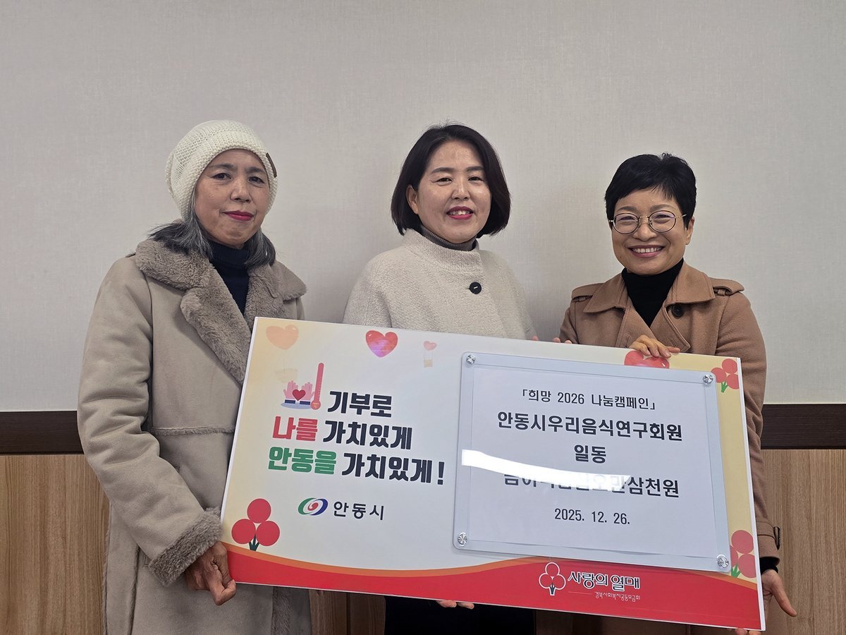 [한국Q뉴스] 안동시우리음식연구회는 지난 12월 26일 연말연시를 맞아 어려운 이웃을 돕기 위해 ‘희망 2026 나눔 캠페인’에 동참하며 235만 3000원을 기탁해 지역사회에 온기를 전했다.