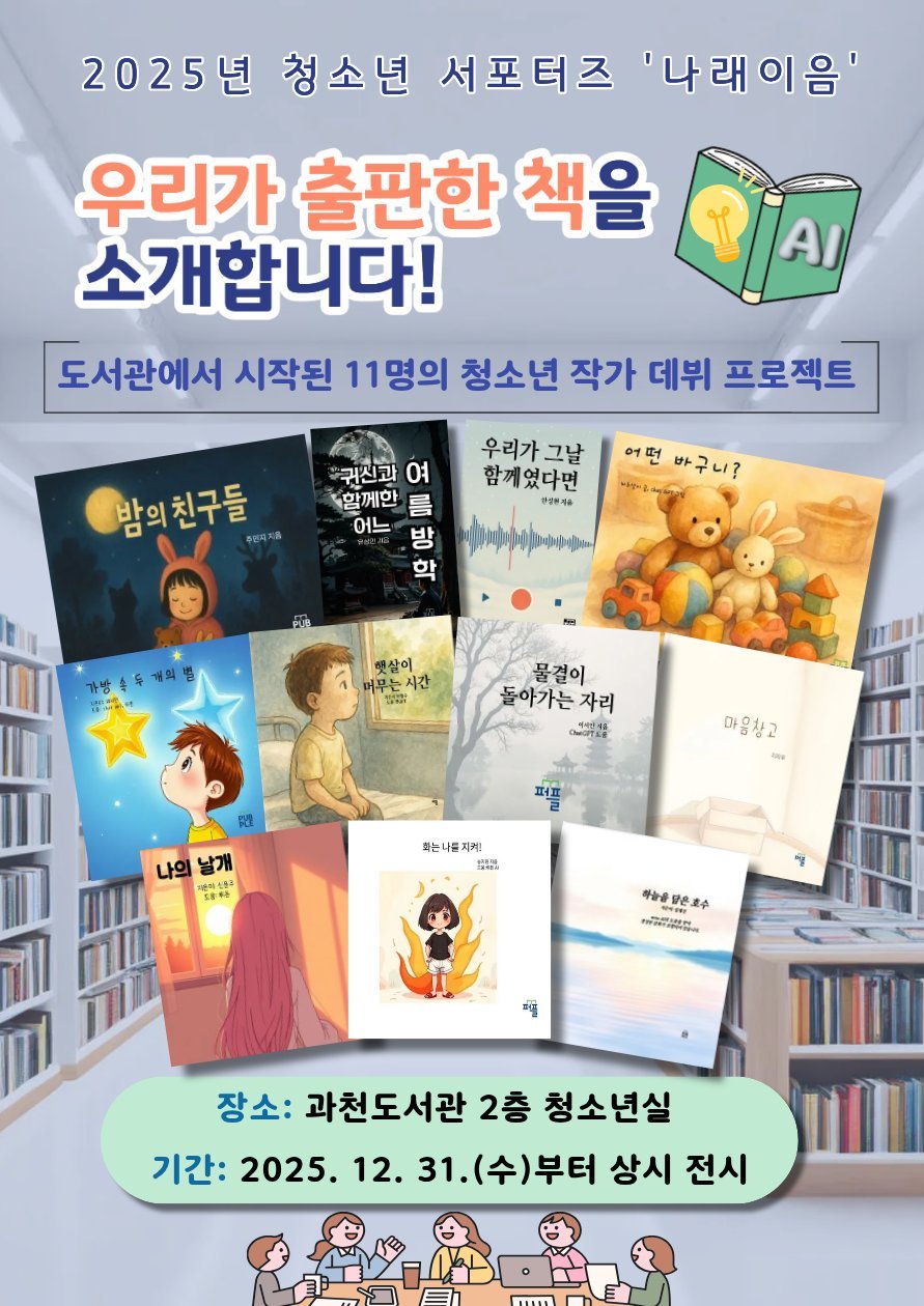 조중복 경기도교육청과천도서관장은 “이번 도서 출판은 도서관의 공유학교 프로그램과 청소년 동아리 활동이 연계되어 만들어낸 뜻깊은 성과”라며 “앞으로도 도서관이 단순히 책을 읽는 공간을 넘어, 청소년들이 꿈을 키우고 창작자로 성장할 수 있는 기회의 장이 되도록 지원을 아끼지 않겠다”고 말했다.