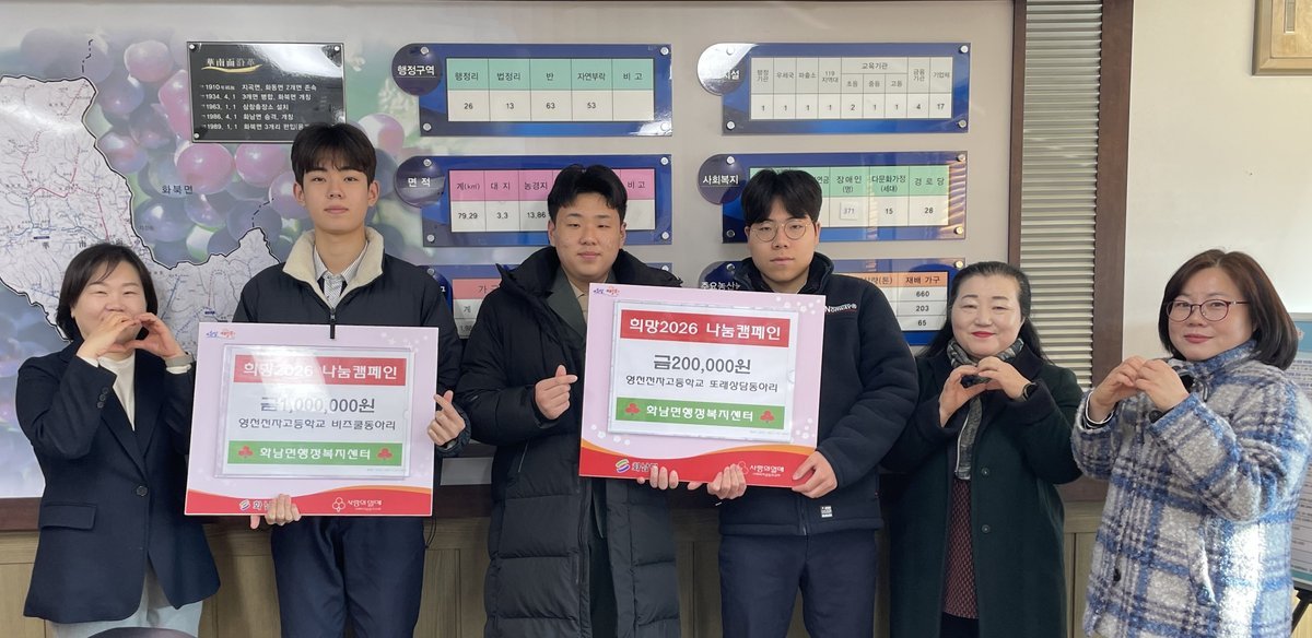 [한국Q뉴스] 화남면은 30일 영천전자고등학교에서 비즈쿨·또래상담 동아리 운영을 통해 마련한 수익금 각 100만원과 20만원, 총 120만원을 ‘희망2026 나눔캠페인’성금으로 기탁했다고 밝혔다.