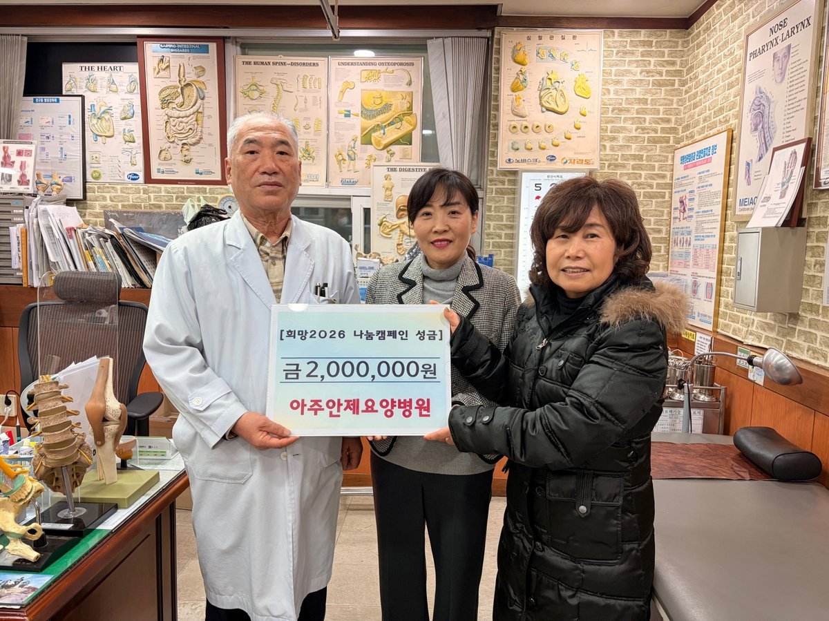 아주안제요양병원이 12월 30일 서구동에 상품권 200만 원을 기탁하며 지역 이웃을 위한 따뜻한 마음을 전했다.