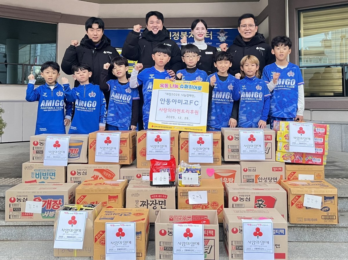 고주희 옥동장은 “한 해의 시작과 끝을 모두 나눔으로 채워 준 안동 아미고FC 축구팀 학생 및 학부모, 직원들께 감사드리며 전달받은 라면은 도움이 필요한 곳에 잘 전달하겠다”며 “앞으로도 청소년들의 건강한 성장이 지역사회와 함께 이어지길 기대하겠다”고 밝혔다.