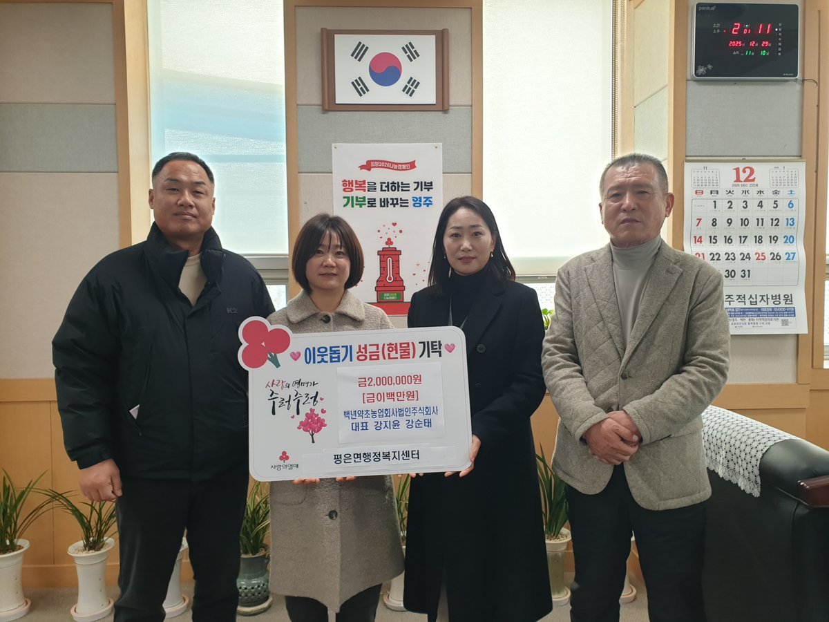 손현숙 평은면장은 “희망2026 나눔 캠페인 기간에 귀한 성금을 기탁해 주신 백년약초에 깊은 감사를 드린다”며 “기탁해 주신 후원금은 꼭 필요한 이웃들에게 소중히 전달하겠다”고 감사의 뜻을 밝혔다 한편, 백년약초는 지역 인재 양성을 위해 영주시 인재육성 장학회에도 꾸준히 기부해 왔다.