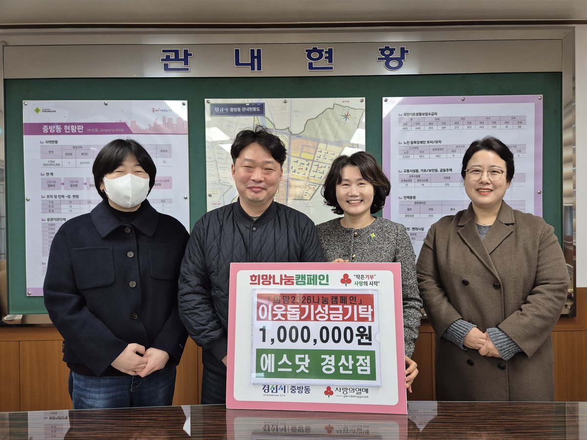 최춘희 중방동장은“연말연시 따뜻한 마음을 전해주신 중방동 바르게살기위원회와 에스닷 경산점에 깊이 감사드린다”며 “기탁해 주신 성금은 도움이 절실한 이웃들에게 소중히 전달하겠다”고 밝혔다.