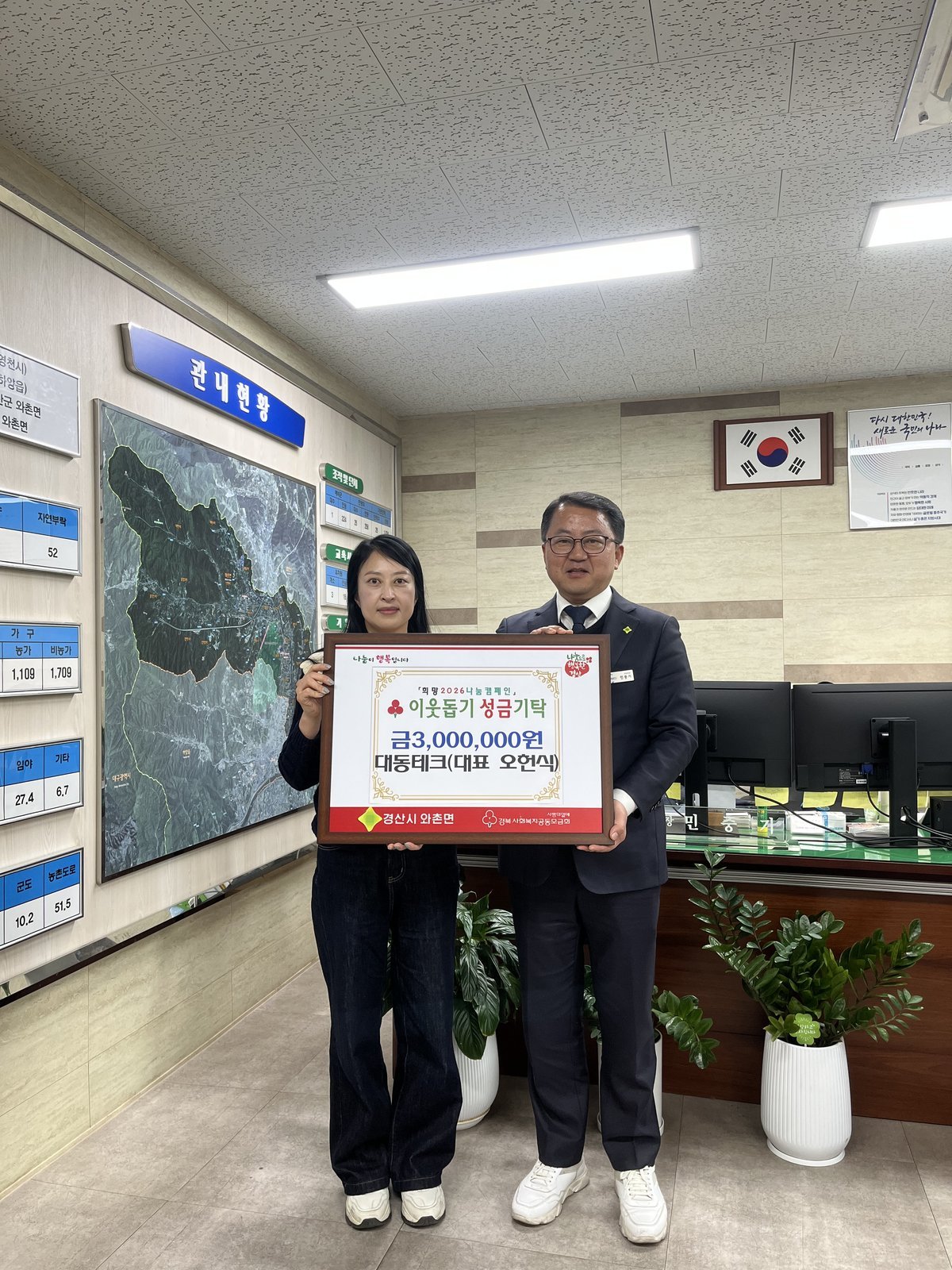 [한국Q뉴스] 연말을 맞아 와촌면「희망 2026 나눔 캠페인」에 동참하는 와촌면 기업의 기부가 이어지면서 연말 사랑의 온도가 뜨겁게 오르고 있다.