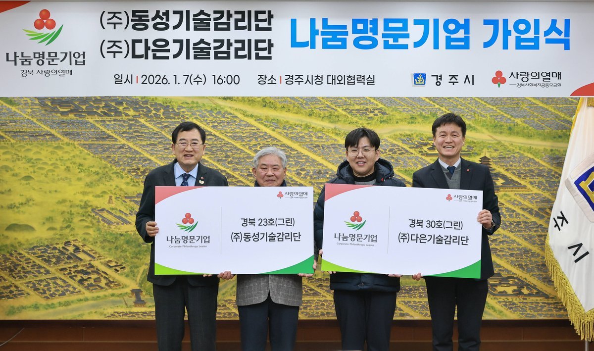 이번 가입으로 ㈜동성기술감리단은 경주시 제3호·경북 제23호, ㈜다은기술감리단은 경주시 제4호·경북 제30호 나눔명문기업으로 등록됐다.