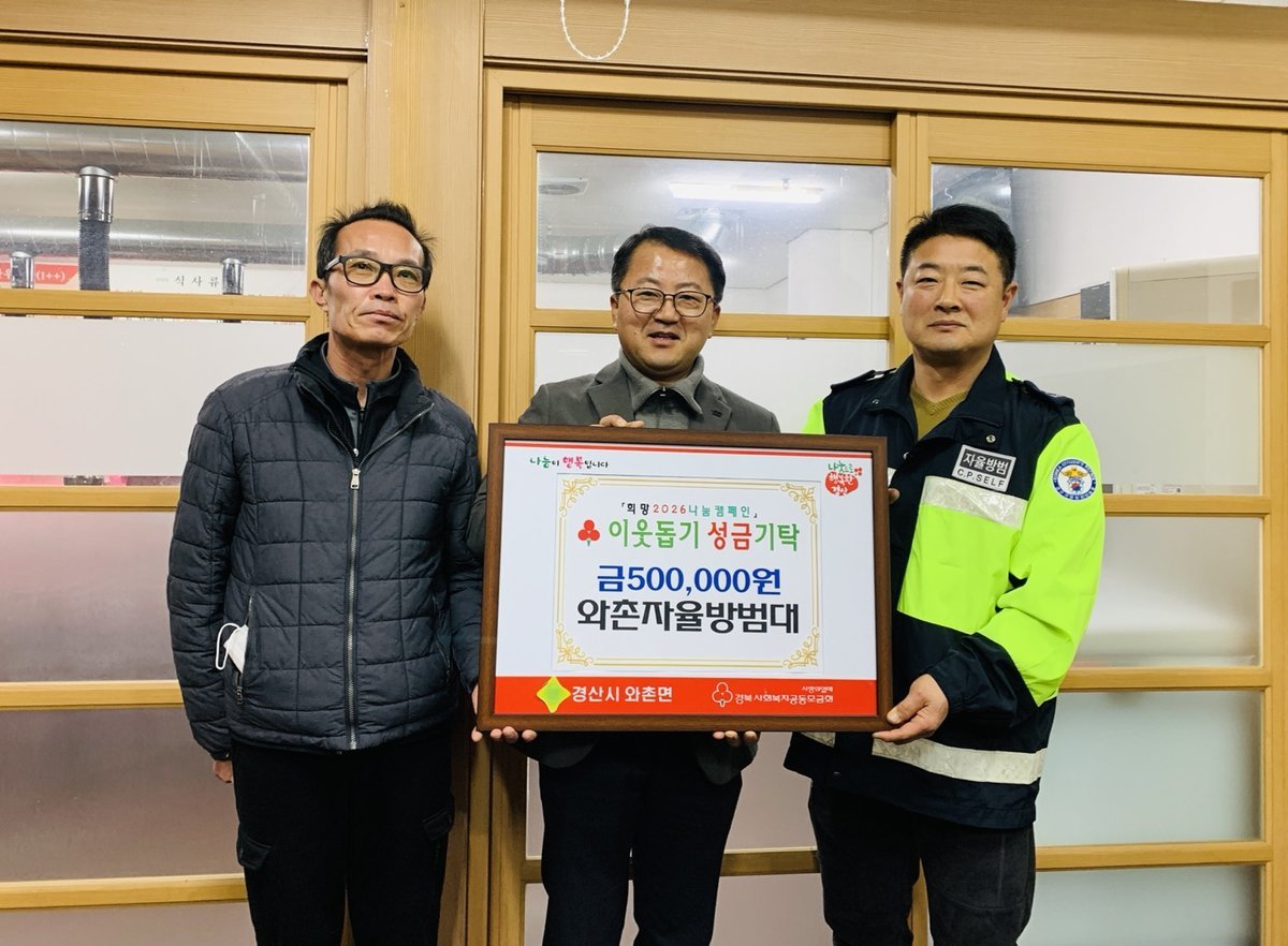 [한국Q뉴스] 와촌자율방범대에서 7일 와촌면행정복지센터를 방문하여 희망 2026 나눔 캠페인에 동참하고자 이웃돕기 성금 50만 원을 기탁했다.