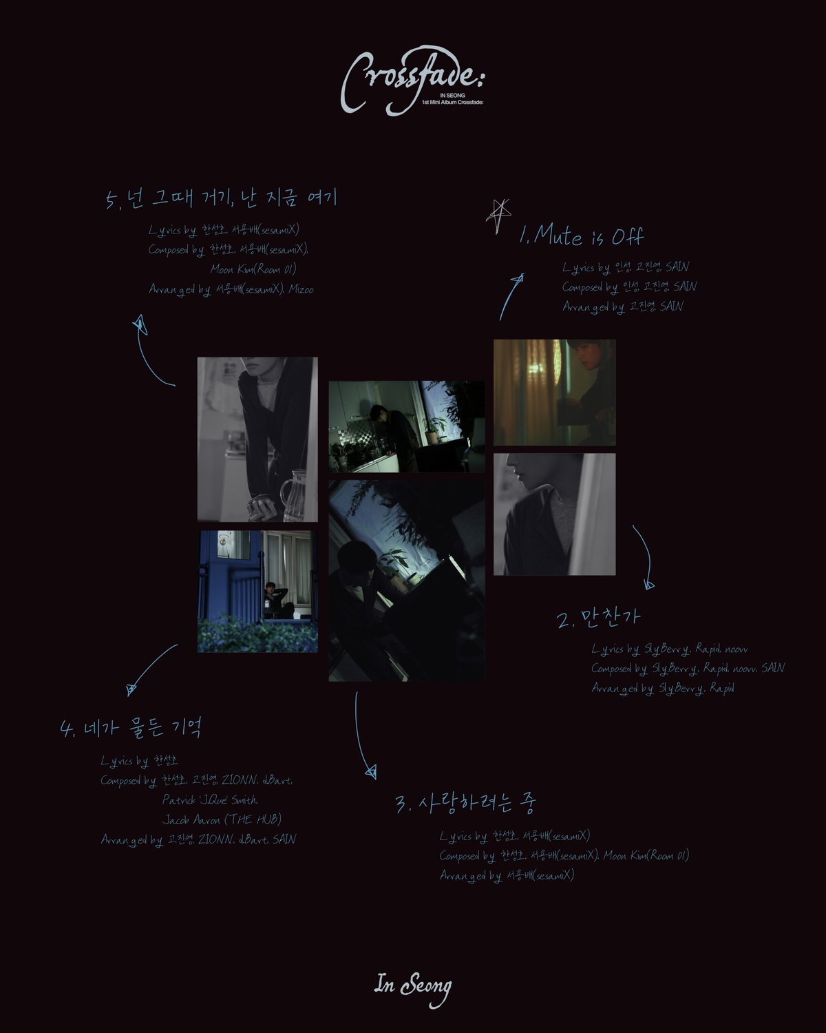 소속사 FNC엔터테인먼트는 9일 공식 SNS를 통해 인성의 미니 1집 ‘Crossfade:’ 트랙리스트가 포함된 타이틀 포스터를 공개했다. 공개된 포스터에는 혼자만의 공간에서 여러가지 감정을 느끼는 인성의 가장 솔직한 모습이 담겨 있다.