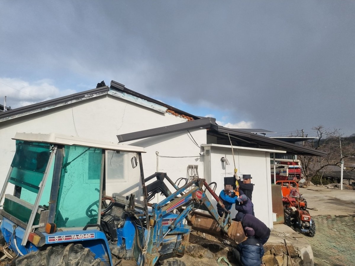 피해 가구는 주말 간 예고 없이 불어닥친 강풍으로 인하여 지붕 등이 심하게 파손되는 등 순식간에 날벼락을 맞은 상황으로 가족 중 몸이 불편한 분도 있어 복구가 걱정이 되는 중 비룡리 정석출 이장을 비롯한 주민들이 상황이 어려운 이웃을 위하여 직접 응급 복구에 나서 급한 상황을 정리하였다.