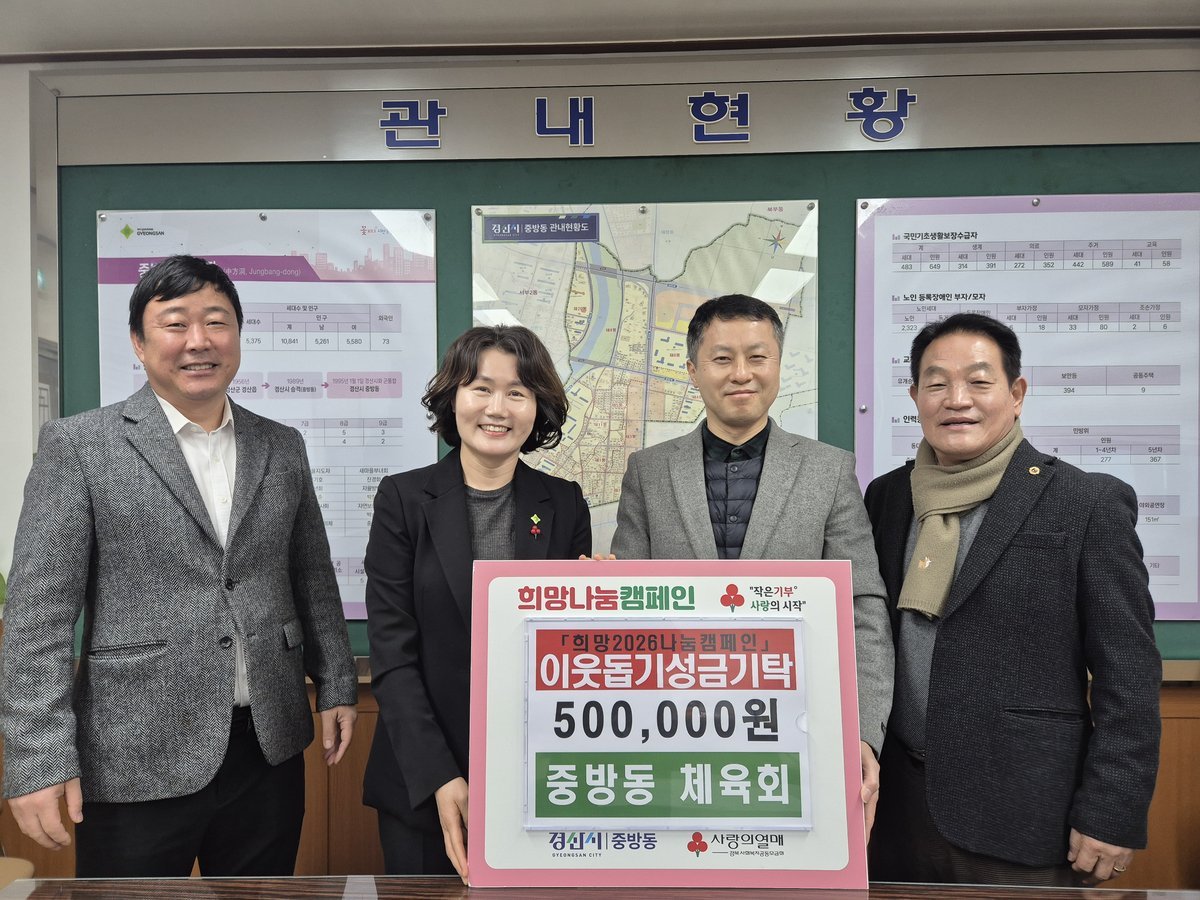 최춘희 중방동장은"여러 단체와 주민들께서 한마음으로 '희망 2026 나눔 캠페인'에 동참해 주셔서 감사드린다"며 "기탁해 주신 소중한 성금은 도움이 꼭 필요한 분들께 투명하고 공정하게 전달하겠다"고 감사의 뜻을 밝혔다.