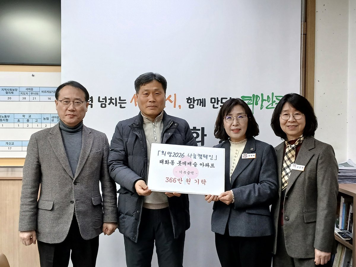 [한국Q뉴스] 안동시 태화동 롯데캐슬아파트는 1월 20일 “희망2026 나눔캠페인”에 동참하기 위해 성금 366만원을 태화동행정복지센터에 기탁했다.