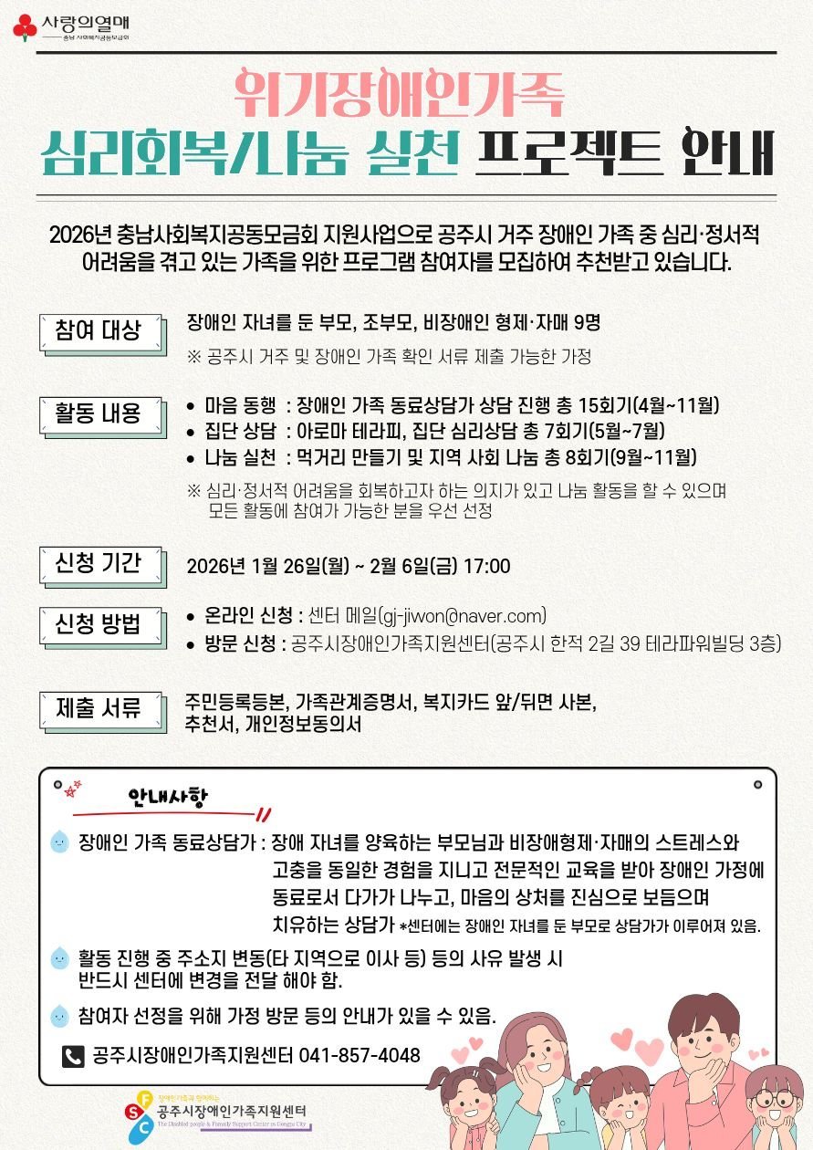 [한국Q뉴스] 공주시 장애인가족지원센터는 2026년 충남사회복지공동모금회 지원을 받아 ‘위기 장애인가족 심리회복 및 나눔 실천 프로젝트’참여자를 모집한다고 26일 밝혔다.