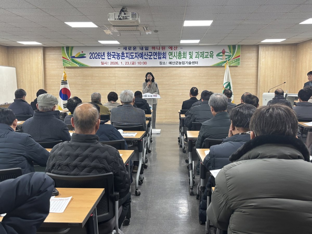 [한국Q뉴스] 예산군농업기술센터는 지난 23일 농업기술센터 세미나실에서 각 읍면 농촌지도자 임원 등 60여명이 참석한 가운데 2026년 한국농촌지도자예산군연합회 연시총회 및 과제교육을 개최했다고 밝혔다.