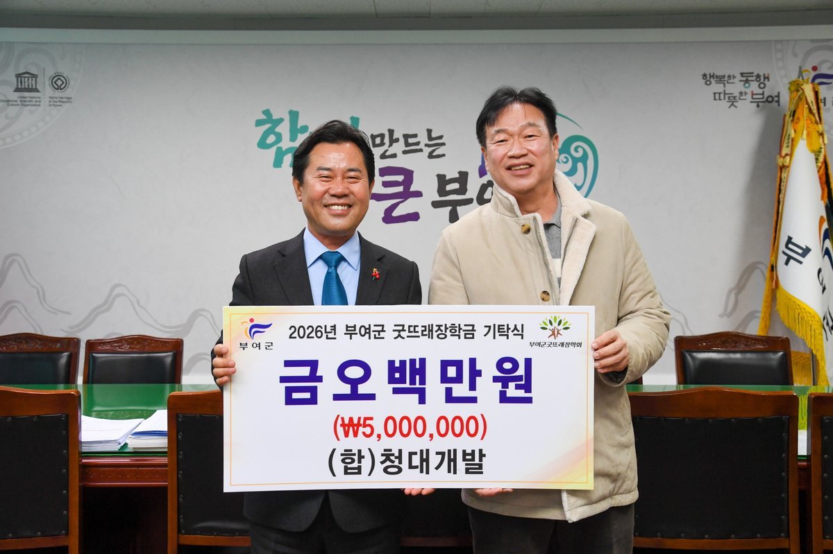 [한국Q뉴스] 부여군은 규암면에 소재한 청대개발이 인재 육성을 위한 장학금 5백만원을 부여군굿뜨래장학회에 기탁했다고 27일 밝혔다.