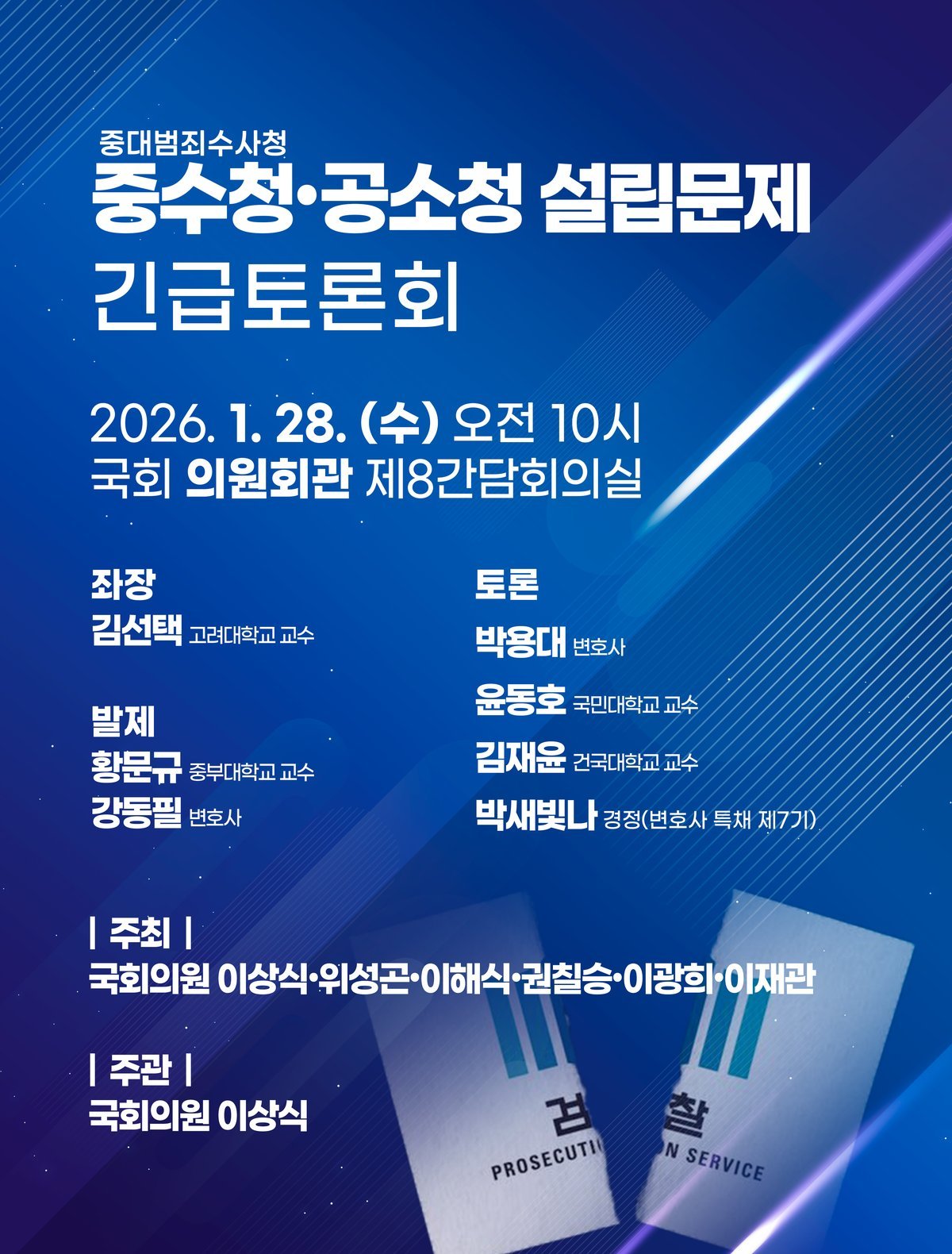 [한국Q뉴스] 더불어민주당 이상식 의원은 오는 28일 오전 10시 국회 의원회관 제8간담회의실에서 '중수청·공소청 법안 긴급토론회'를 개최한다고 밝혔다.