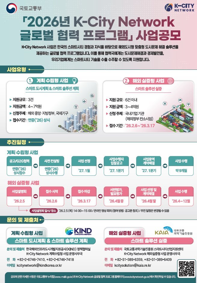 [한국Q뉴스] 정부가 국내 스마트도시 기술의 해외 진출을 지원하기 위해 올해「K-City 네트워크 글로벌 협력 사업*」 공모를 추진한다. 이번 사업을 통해 기업들은 해외 도시에서 자사 기술을 직접 실증하고, 현지 여건에 맞는 사업 모델을 검증해 실제 수주와 사업화로 이어질 수 있는 기회를 얻게 된다.
