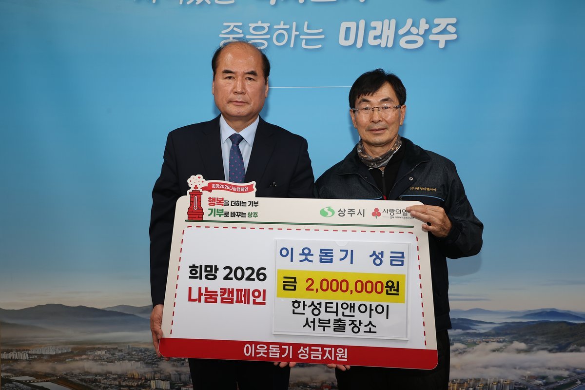 [한국Q뉴스] 상주시 소재 한성티앤아이 서부출장소는 1월 27일 상주시청 시민의 방을 방문해 어려운 이웃을 돕기 위한 성금 200만원을 기탁하며 따뜻한 나눔을 실천했다.