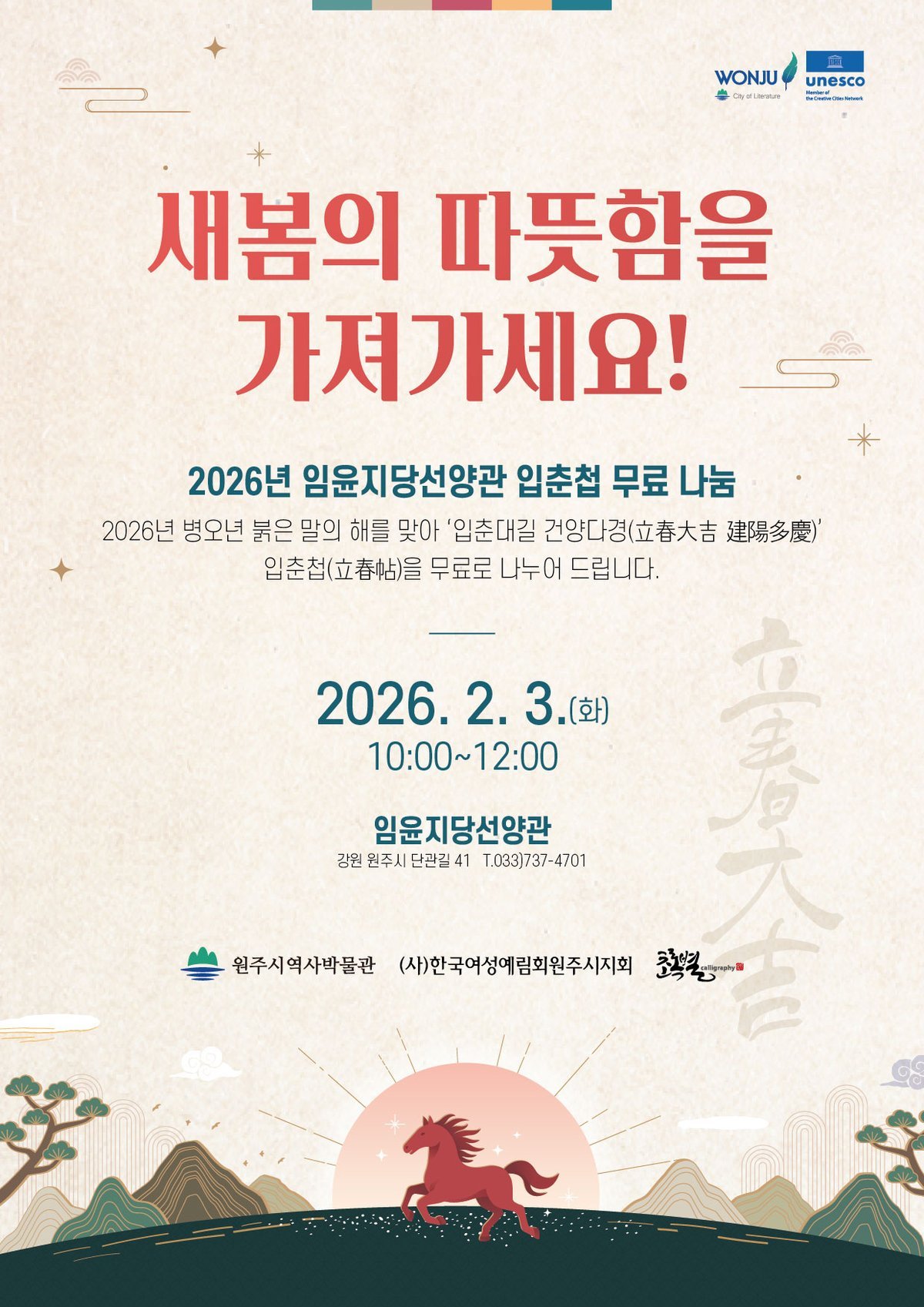 선양관 관계자는 “병오년, 붉은 말의 해를 맞아 지역 주민들의 가정에 건강과 안녕을 기원하는 마음을 담아 행사를 준비했다”며 “많은 시민께서 방문하셔서 입춘첩을 받아 가시길 바란다”고 말했다.
