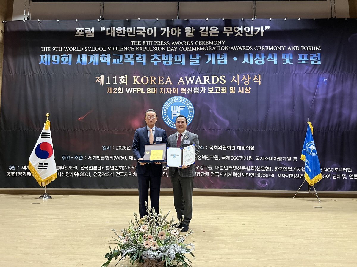 이번 시상은 세계청년리더총연맹과 지자체 혁신평가기구가 주관해, 지방자치 발전과 주민 삶의 질 향상에 기여한 광역·기초의원 및 자치단체를 대상으로 정책 혁신성, 현장성, 지속가능성을 종합 평가해 선정한다.