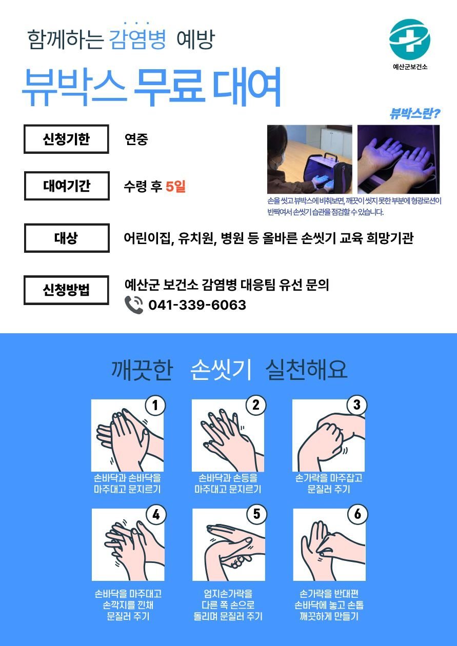 [한국Q뉴스] 예산군보건소는 지역 내 유치원과 어린이집, 초·중·고등학교, 병원 등을 대상으로 감염성 질환을 차단하고 올바른 손 씻기 습관 형성을 돕기 위해 ‘손 씻기 체험기기 무료 대여 사업’을 실시한다.