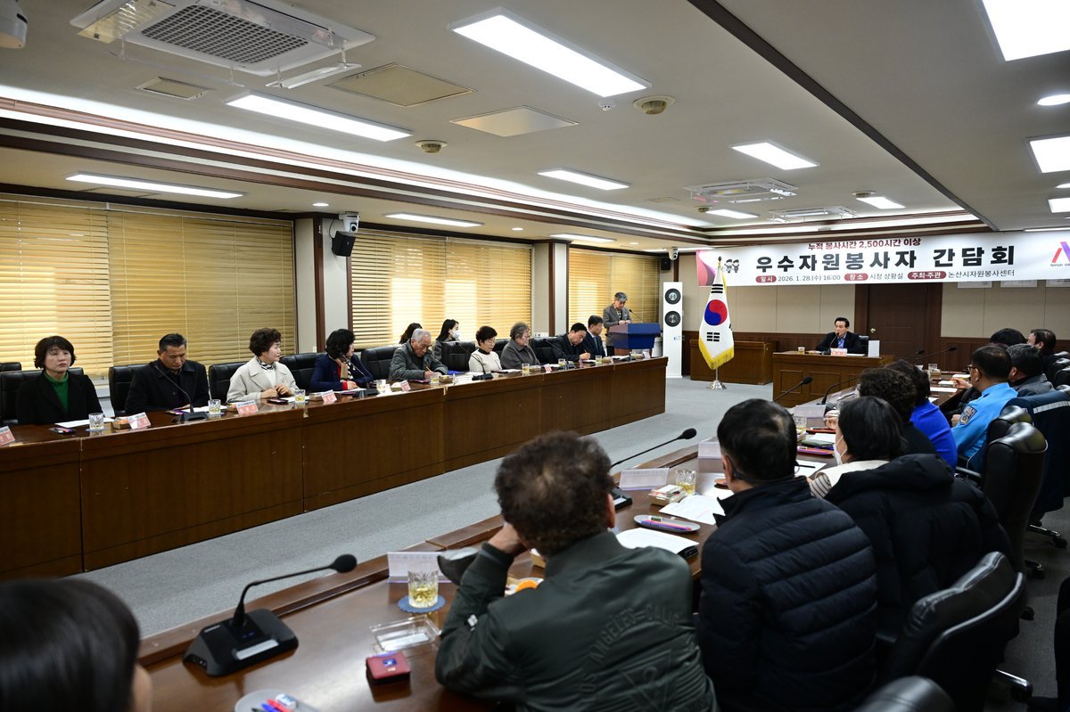 [한국Q뉴스] 논산시자원봉사센터는 지난 28일 누적 봉사시간 2500시간 이상을 기록한 우수자원봉사자들과 뜻깊은 간담회를 개최했다.