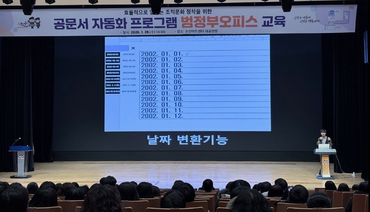[한국Q뉴스] 논산시는 지난 28일 논산아트센터 대공연장에서 저연차 공무원을 대상으로 공문서 자동화 프로그램‘범정부오피스’교육을 실시했다.