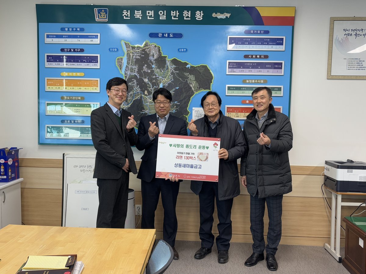 [한국Q뉴스] 성동새마을금고에서 2026년 1월 28일 천북면에 거주하는 저소득층 이웃을 위해 천북면행정복지센터에 라면 130박스를 기탁했다.