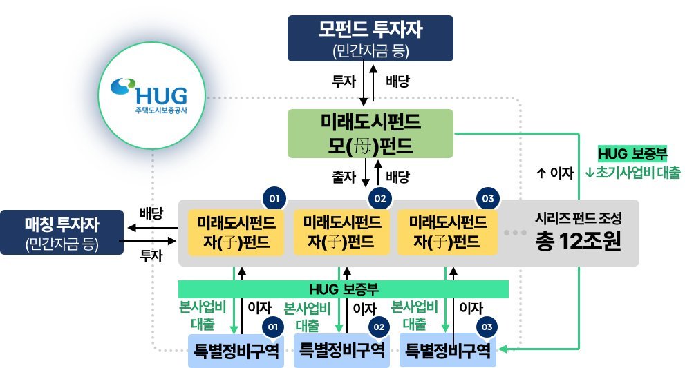 미래도시펀드는 대규모 재원이 소요되는 노후계획도시 정비사업의 초기 사업비, 공사비 등을 HUG 보증을 통해 낮은 금리로 안정적으로 조달하는 정책펀드로,