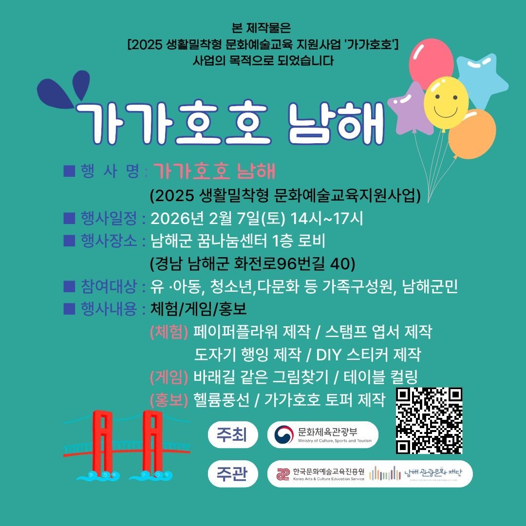 이번 행사는 생활밀착형 문화예술교육 지원사업의 일환으로 ‘‘가가호호 남해’라는 명칭으로 추진된다.